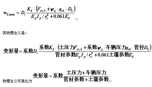 目前世界各國在埋地管道的設計計算方面還沒有完全一致的方法,但是絕大多數(shù)國家都以美國SpanglerR公式(或稱Spangler的 lowa 公式)作為計算埋地柔性管外壓負載下變形量的基礎公式(根據(jù)變形量再計算出管材內(nèi)的應力)。Spangler公式如下: