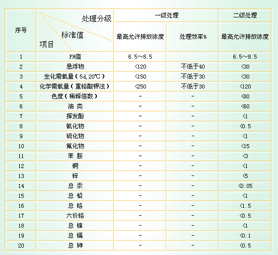 注:1、pH、生化需氧量和化學需氧量的標準值系指24h定時均量混合水樣的檢測值; 其它項目的標準值為季均值。